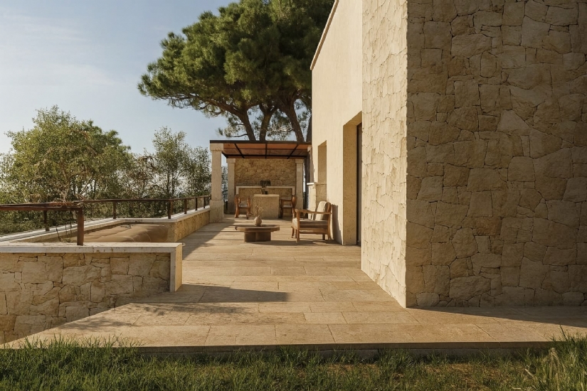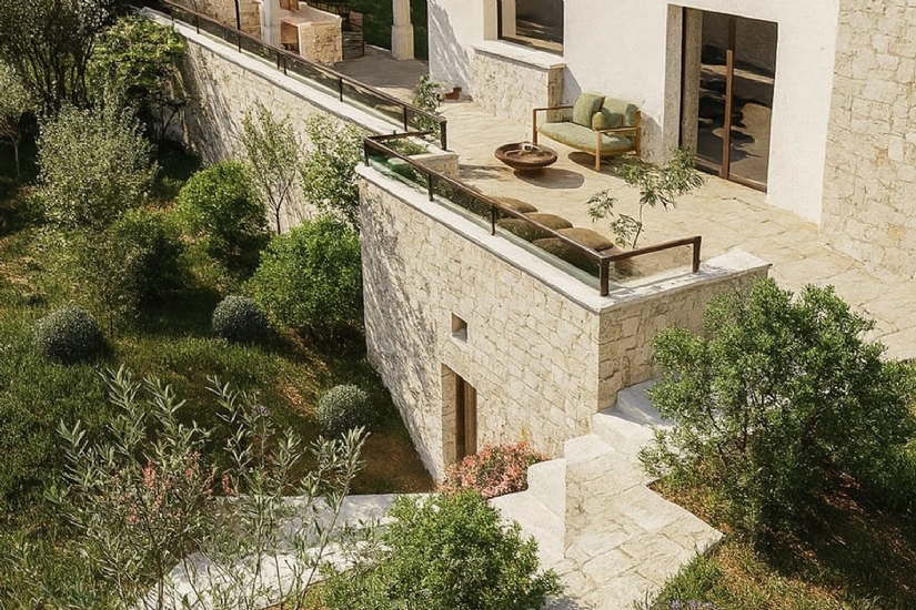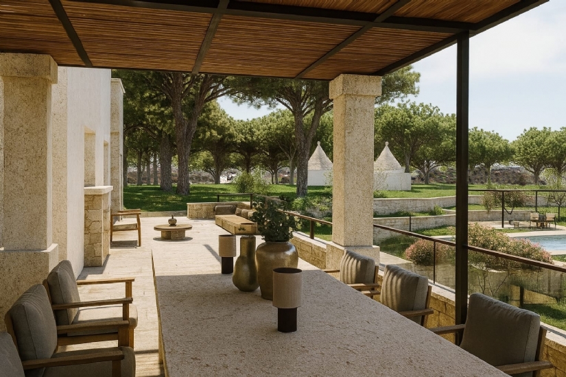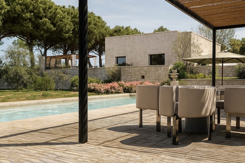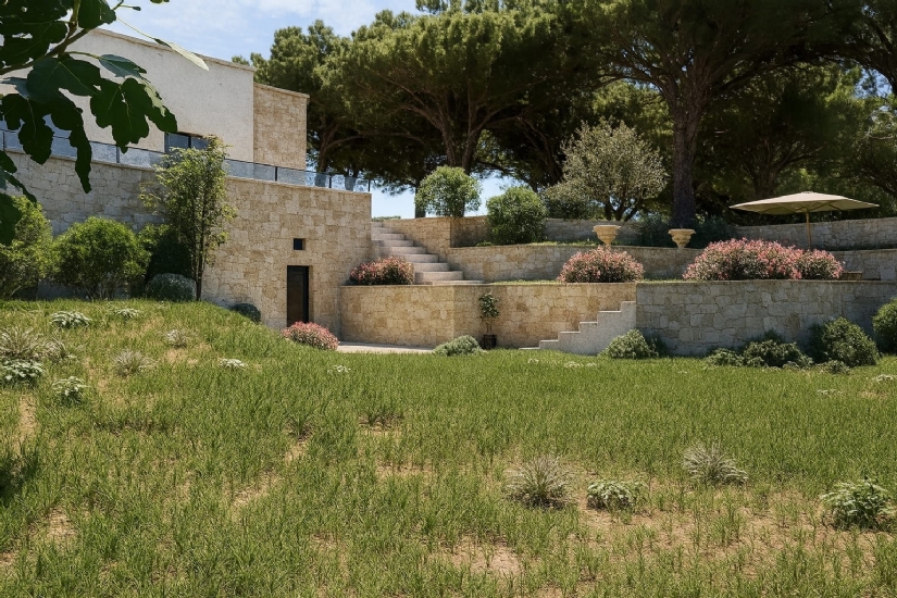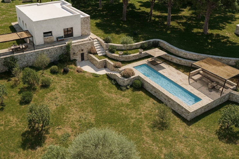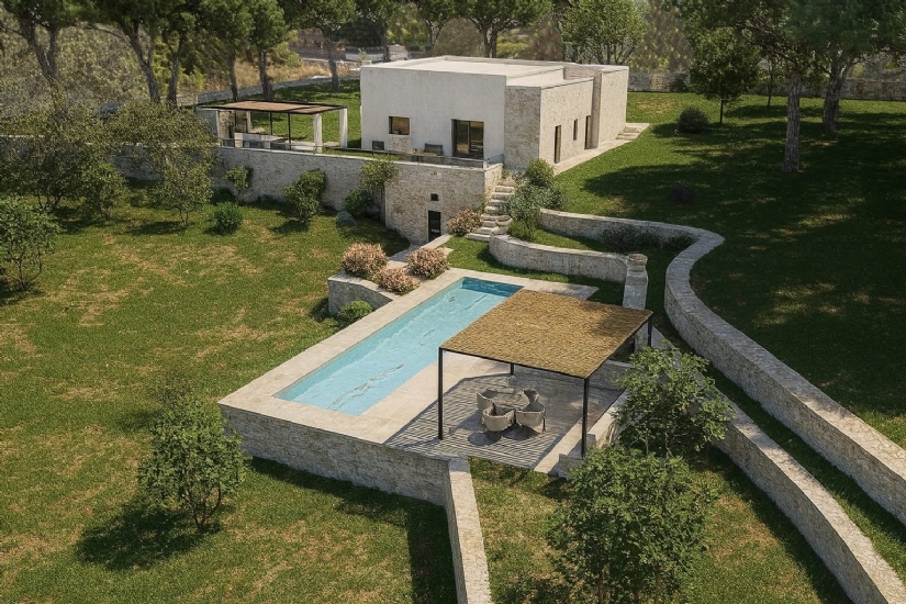 Inoltre, le strutture sono collegate all'acquedotto, dispongono di fossa imhoff; La proprietà si completa con un meraviglioso terreno piantumato da pineta privata, frutteto ed oliveto.